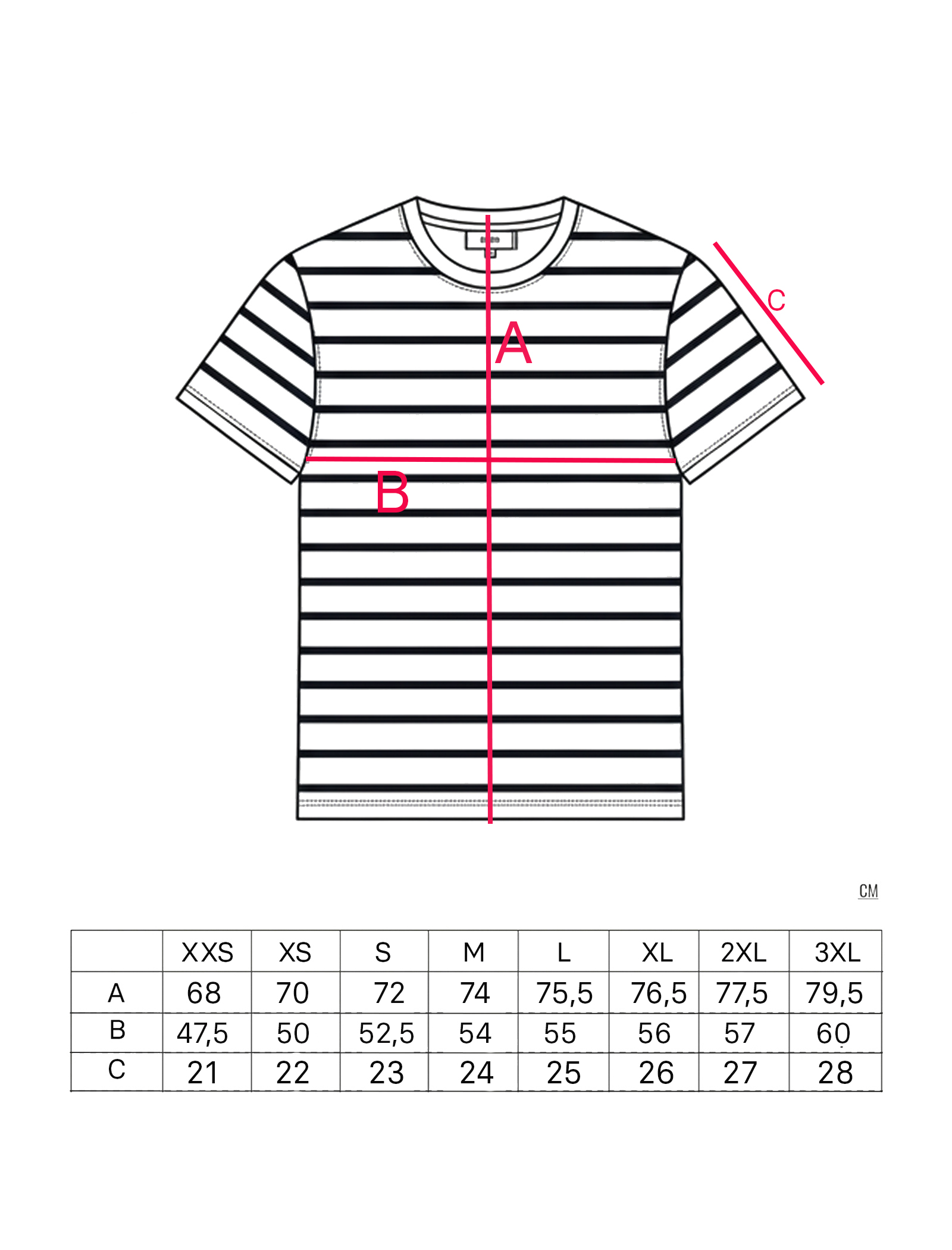 Camiseta blanca con rayas azules, de manga corta y corte holgado unisex. Un básico atemporal 100% algodón orgánico de alta calidad, perfecta para combinar con tus delantales QOOQER favoritos.